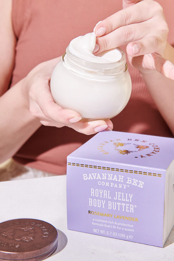 Super-rich, luxurious moisture fit for a queen! Combining royal jelly and other hive treasures with the aroma therapeutic benefits of reviving rosemary and calming lavender essential oils, our signature formula body butter delivers deep nourishment and antioxidants to keep skin glowing and soft.