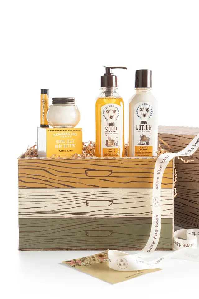 Our most asked for gift set and perfect for the person who appreciates life’s precious gifts. Tupelo Honey body care products, made from the very rare tupelo honey harvested in South Georgia. All are safely packed inside our collectable Savannah Bee Company Bee Box Gift Box. This extraordinary and reusable gift box is finished with a satin “save the bees” printed ribbon and gift message from you.